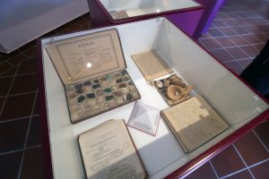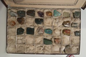Zbirka kamnov (žal v tej škatli kar nekaj kamnov manjka. Večji del zbirke je p. Janez podaril fakulteti in šolam.
